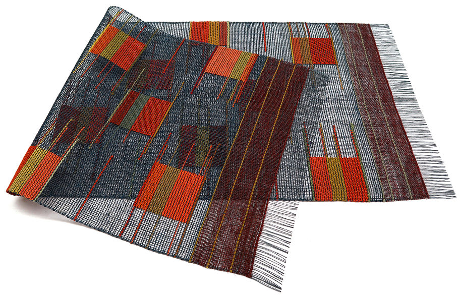 Custom dyed linen ground weave and inlays of silk, linen, cotton, bamboo.